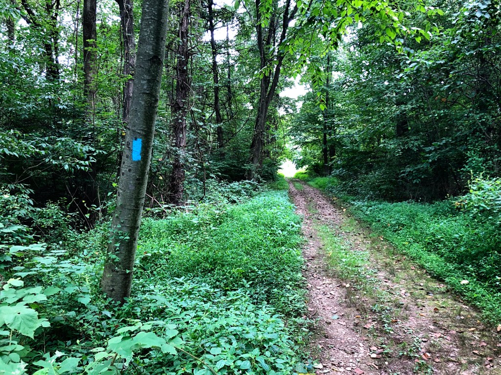 Youโll pass a few blue-blazed wooden posts as well as the junction for the Conestoga Trail (orange blazes) on your right at around the half-mile mark. Continue to the far side of the field.